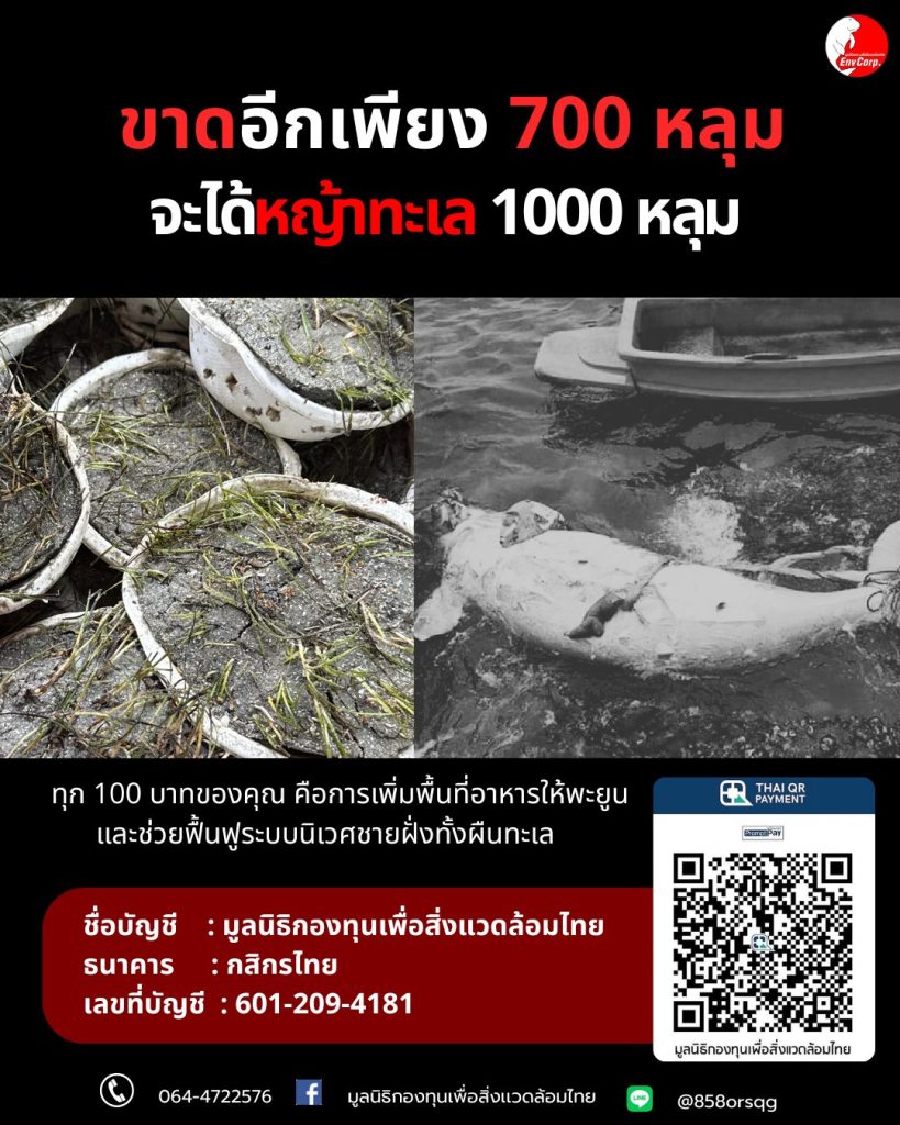 มูลนิธิกองทุนเพื่อสิ่งเเวดล้อมไทย เชิญชวนทุกท่านร่วมบริจาคเพื่อโครงการ “Dugongs Lives Matter “ ปลูกหญ้าทะเลฟื้นฟูระบบนิเวศ เเละร่วมอนุรักษ์ทะเลไทยไปพร้อมกันกับเรา